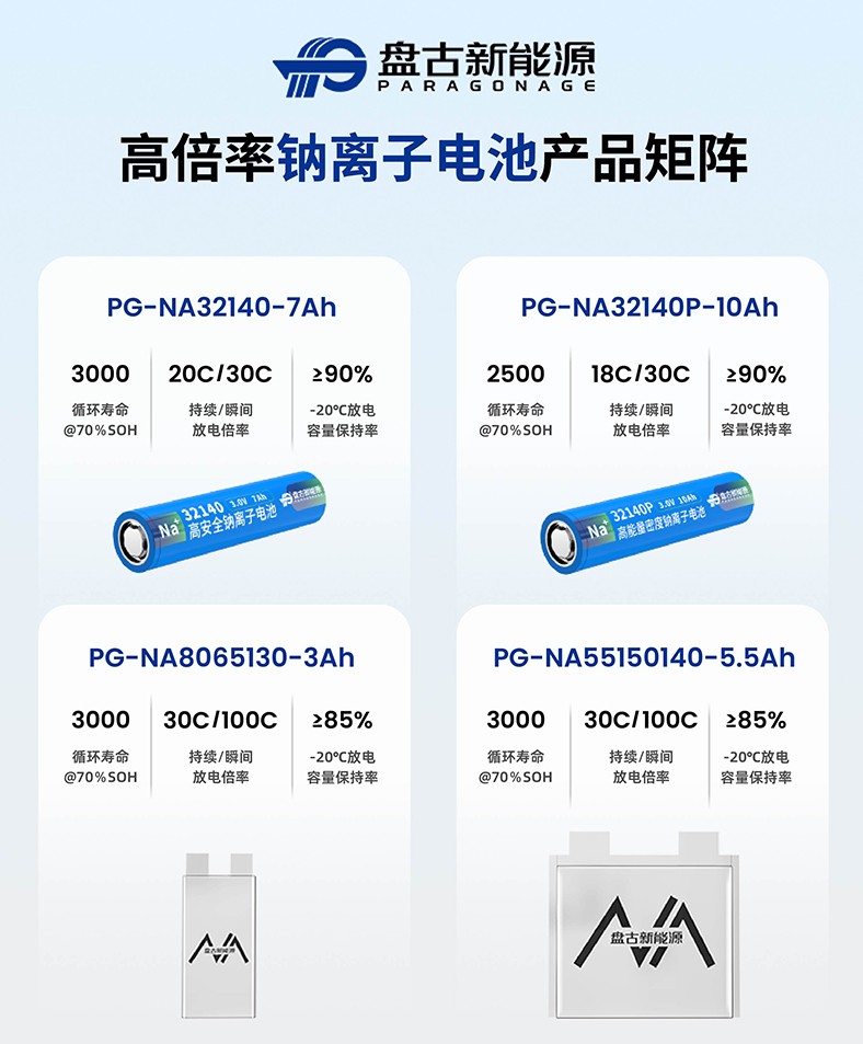 作为国内最早布局高倍率钠离子电池的企业之一,盘古新能源自2022年成立以来,便将“突破钠离子电池倍率性能边界”作为核心战略方向。通过持续研发投入,公司已形成覆盖3Ah到10Ah的高倍率钠电产品矩阵,最高可以支持100C瞬时放电,50C持续放电,低温-20℃放电效率约90%,-40℃放电效率约80%,产品性能指标均处于行业领先地位。