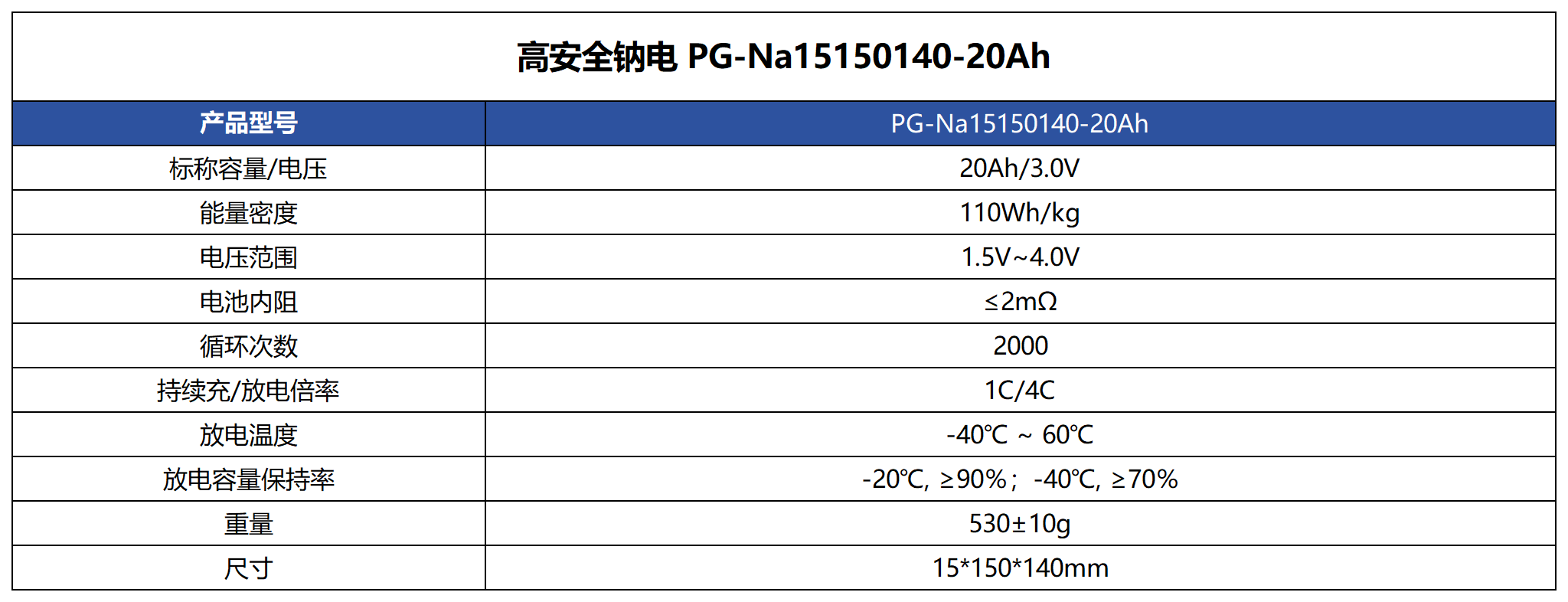 高安全钠电 15150140-3.0V-20Ah