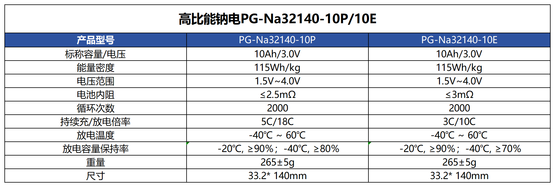 高比能钠电 PG-Na32140-10P/10E